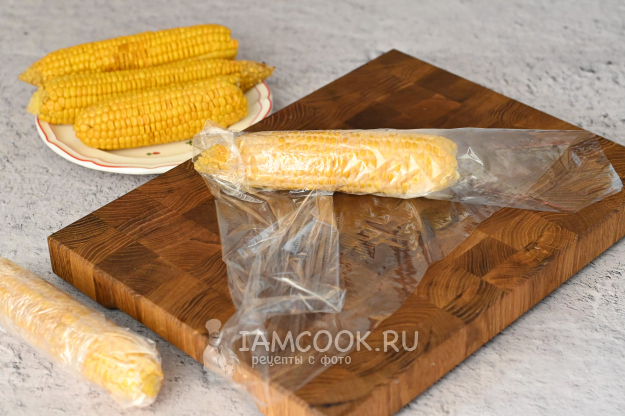 Каждый початок кукурузы оберните плотно пищевой пленкой, подгибая края внутрь.