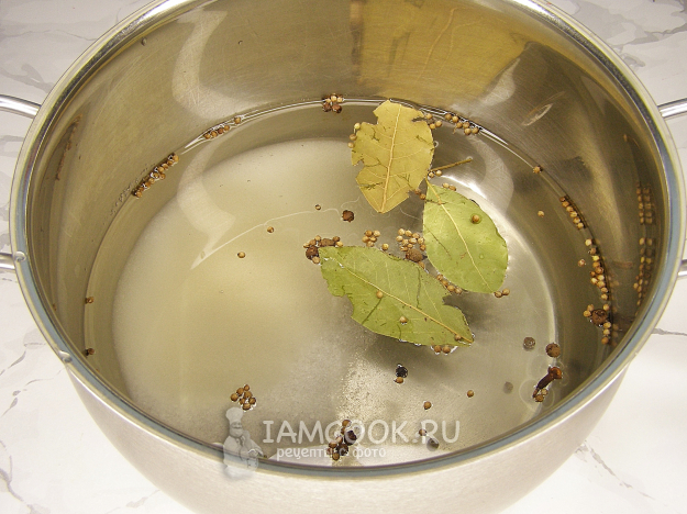 В кастрюлю наливаем воду, добавляем сахар, соль, лавровый лист, чёрный и душистый перцы горошком, гвоздику и кориандр. На сильном огне доводим до кипения и варим минут 5-7. В конце варки добавляем уксус и перемешиваем.