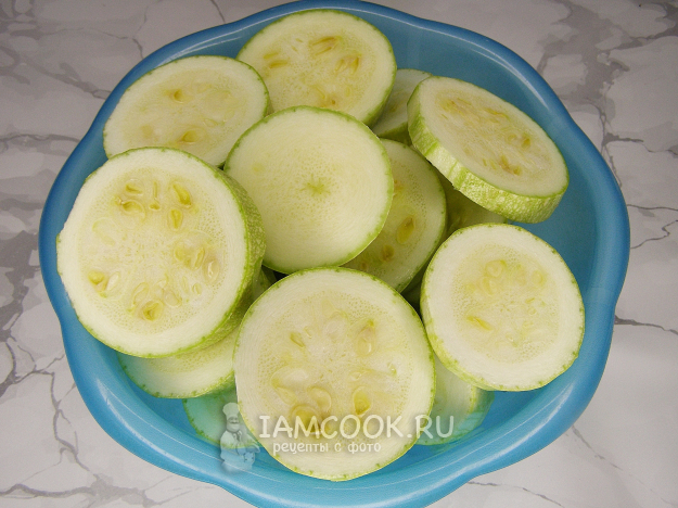 Кабачки моем, срезаем хвостики, удаляем испорченные места. Нарезаем шайбочками по 1-1,5 см толщиной.
