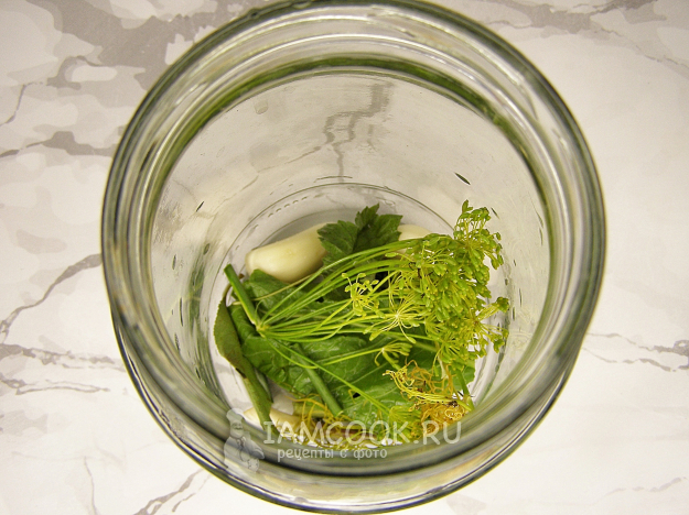 Банки и крышки тщательно моем и стерилизуем. На дно выкладываем листья смородины и вишни, очищенные зубчики чеснока, зонтик укропа.