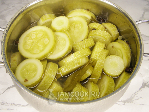 В кипящий маринад перекладываем нарезанные кабачки, снова доводим до кипения и варим после закипания еще 5-7 минут. Все кабачки сразу могут не поместиться в кастрюлю, поэтому их можно варить партиями, в два захода.