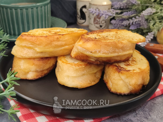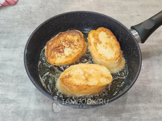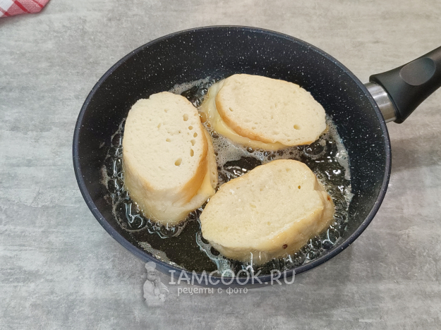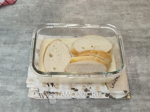 Каждую заготовку окунаем в молочно-яичную смесь. Нужно, чтобы хлеб полностью пропитался смесью, но при этом не размок и не развалился.