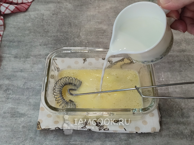 В подходящей миске взболтайте яйца, добавьте к ним молоко, соли по вкусу, тщательно размешайте. Добавляя соль, не забывайте, что сыр тоже содержит соль, я добавила буквально щепотку.