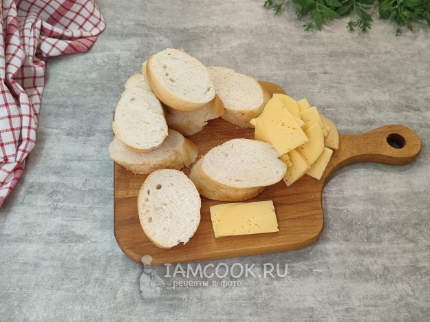 Сыр нарежьте тонкими пластинками соразмерно ломтикам багета.