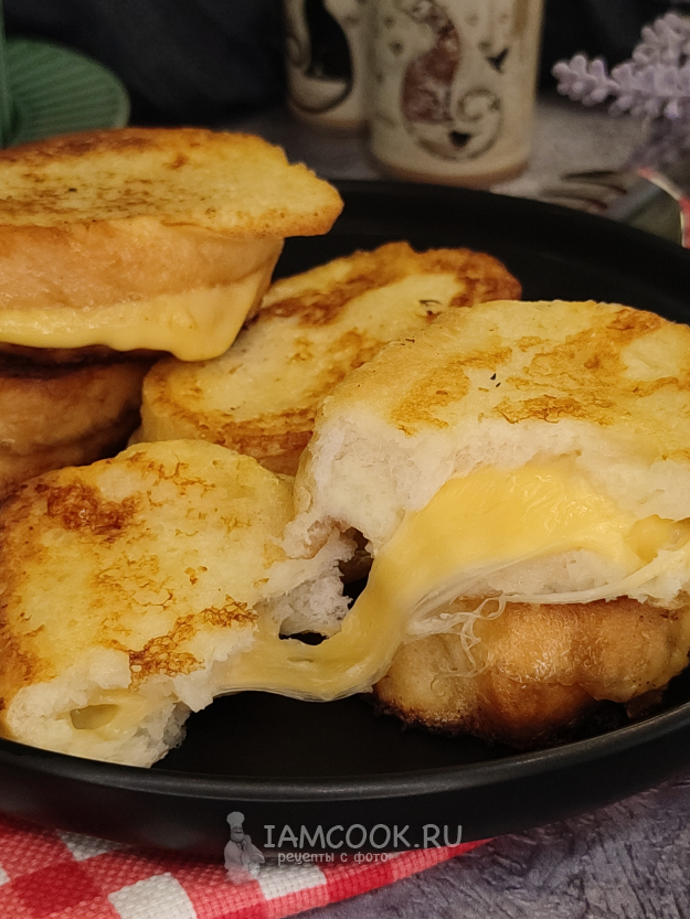 В сковороде растопите сливочное масло, добавьте к нему растительное, заготовки выложите в сковороду и на среднем огне (6-7 из 9) обжаривайте тосты до румяной корочки.