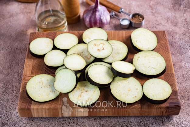Баклажан нарежьте кружочками толщиной примерно в 3-4 мм.