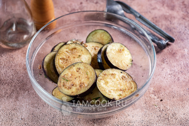 Кружочки баклажанов выложите в удобную миску и к ним выложите пряную смесь, затем залейте растительное масло и все перемешайте между собой ложкой (или руками).