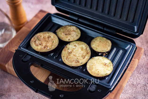 Установите на мультипекарь рабочие поверхности "Гриль", смажьте их тонким слоем растительного масла с помощью силиконовой кисточки, разогрейте мультипекарь до необходимого температурного уровня (у меня зажигается при этом зеленый индикатор на устройстве). Кружочки баклажанов разложите по рабочей поверхности мультипекаря и накройте крышкой. Готовьте баклажаны в мультипекаре в соответствии с рекомендациями производителя вашего устройства - я готовила 4 минуты.