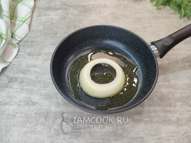 Разрежьте лук поперек, довольно широкими (около 1 см) кольцами. Из самых широких по диаметру кружков отделите 2-3 внешних слоя лука. Оставшийся лук оставьте для других блюд.