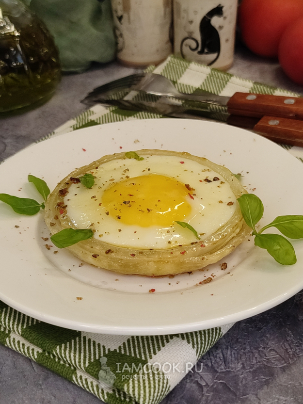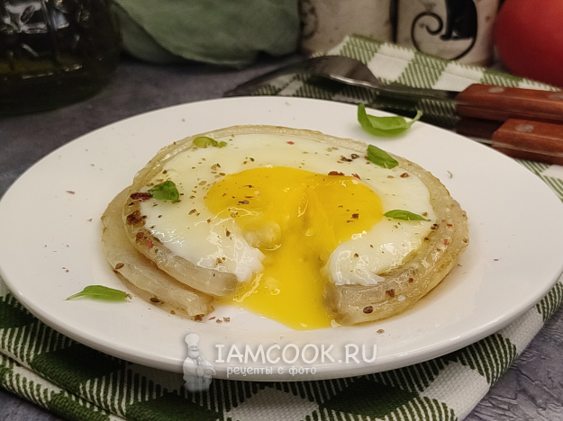 Мне нравится, когда желток остается жидким. Можно подать яичницу в луке просто так, с небольшим ломтиком хлеба.