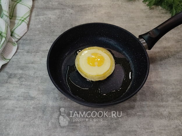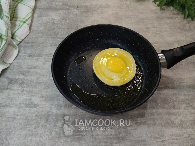 Затем его переверните, влейте яйцо. Для удобства яйцо сначала можно выбить в мисочку, зачем в луковое кольцо.
