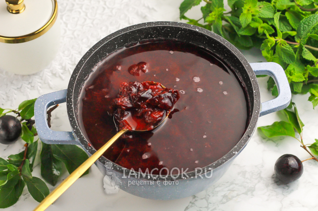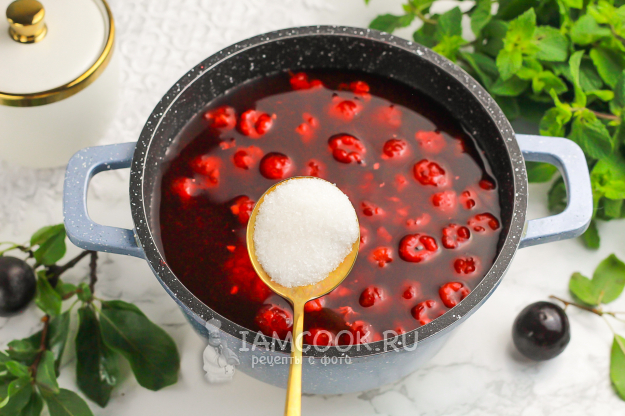 Всыпьте сахарный песок и другие сладкие пряности. Лимонную кислоту или лимонный сок не добавляйте, так как сок алычи сам по себе кислый. Проварите компот примерно 10 минут с момента закипания. Ошпарьте банку и крышку кипятком.