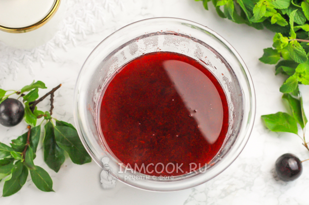 Перелейте сок алычи в емкость и добавьте малину. Долейте немного горячей воды, если это потребуется.