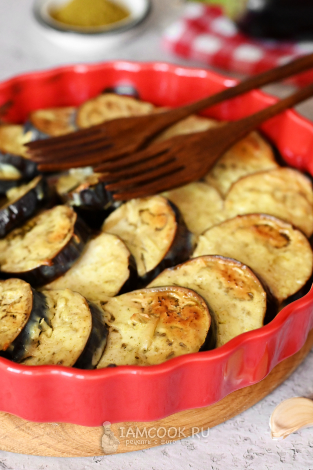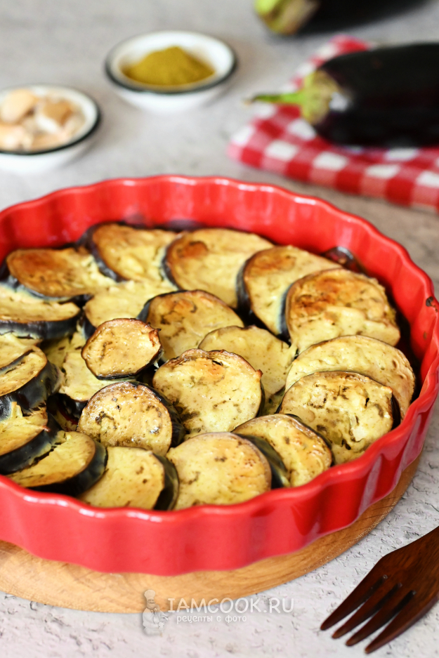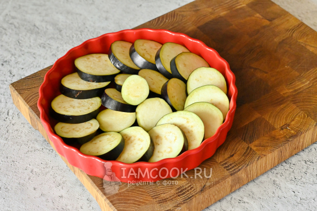Кружочки баклажанов выложите в форму для запекания немного внахлёст.