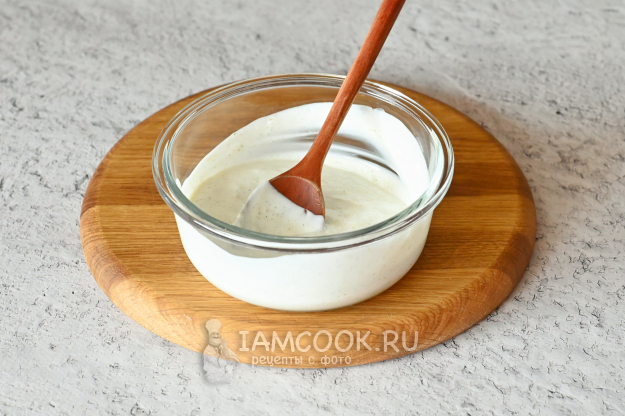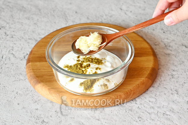 В мисочку отправьте йогурт, добавьте по вкусу соль и хмели-сунели, а затем добавьте измельчённый на мелкой тёрке чеснок.