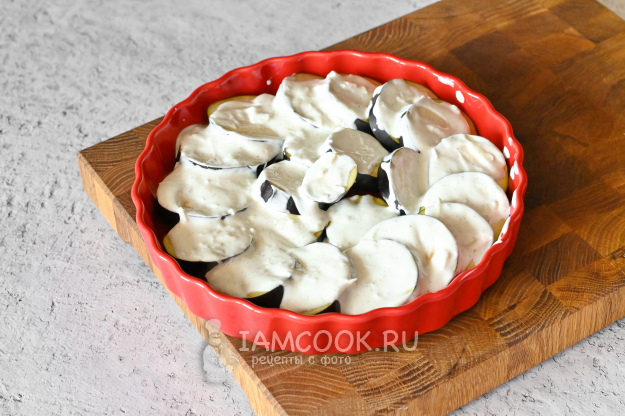 Сверху распределите йогуртовую заливку. Важно, чтобы она попала на все кусочки баклажанов, так как мы их ничем не приправляли.