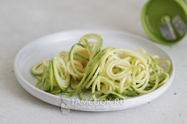 Кабачки промойте, обсушите. Зрелые кабачки рекомендую почистить. При помощи спиралайзера, терки для корейской моркови или ножа приготовьте овощные спагетти.