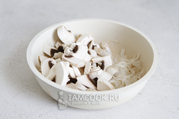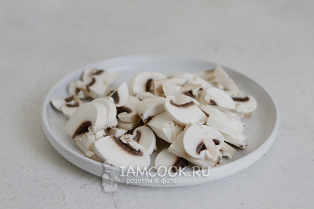 Шампиньоны очистите, промойте и обсушите. Нарежьте пластинами.