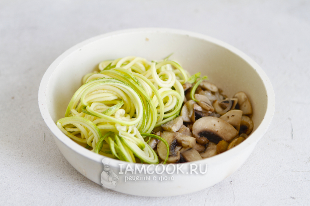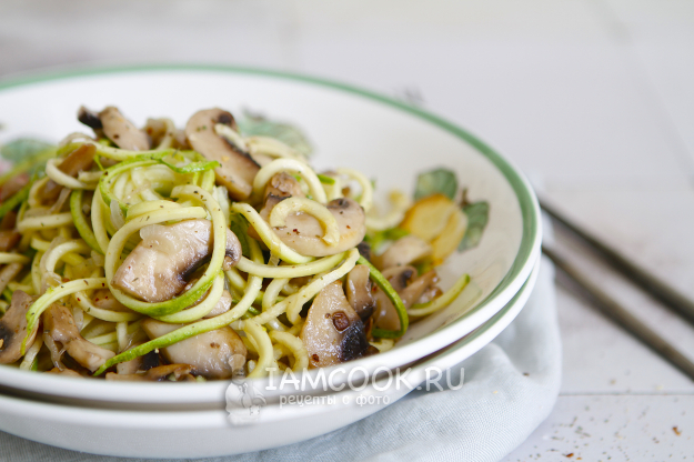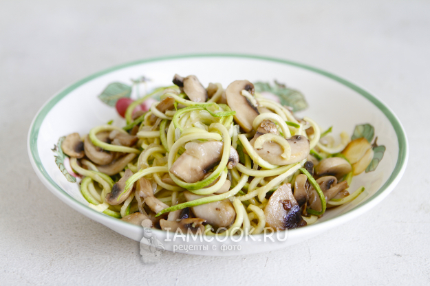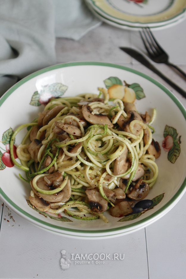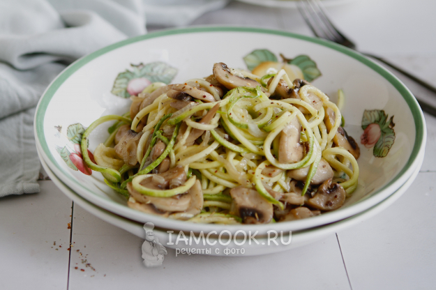 Готовые спагетти из кабачков с грибами разложите по тарелкам и подавайте к столу.