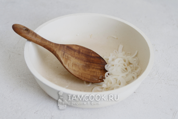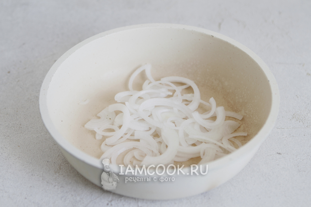 Почистите одну небольшую головку репчатого лука и нарежьте ее полукольцами.