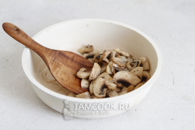 Продолжайте обжаривать овощи, пока грибы не пустят сок и он не выпарится.