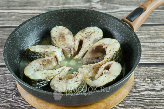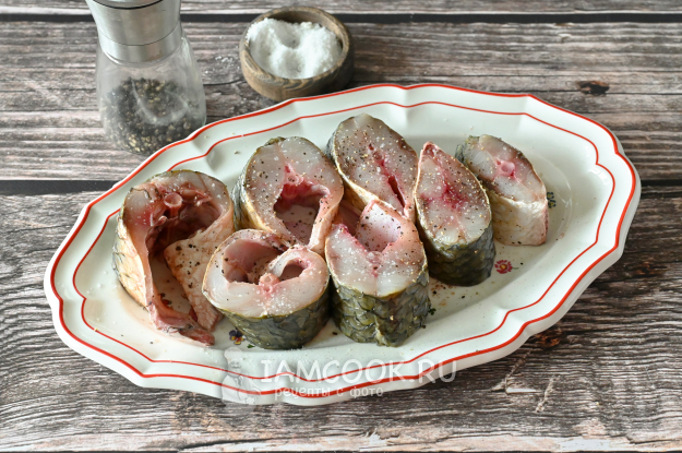 Кусочки кефали приправьте солью и перцем с двух сторон.