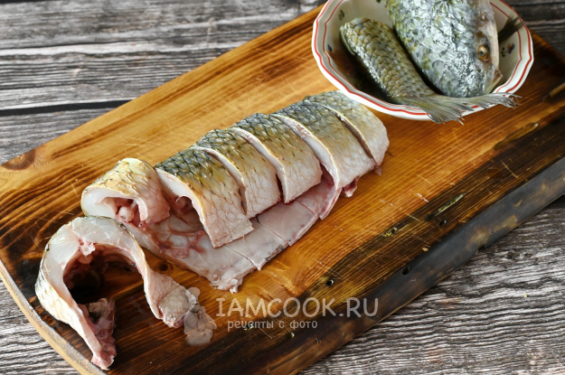 А центральную часть тушки нарежьте на стейки толщиной примерно 3-4 сантиметра.