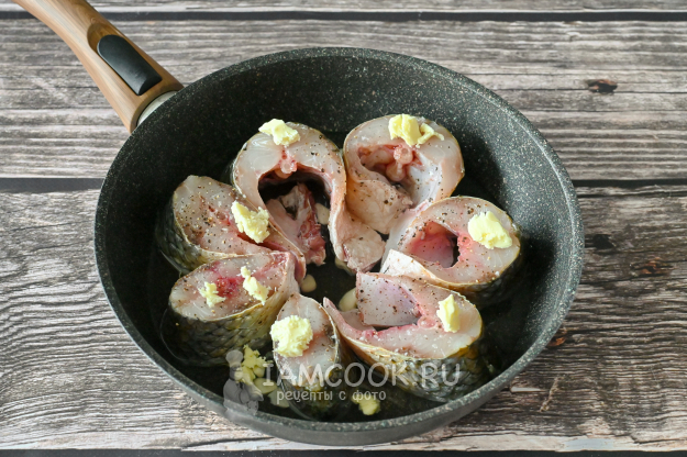 Выложите в сковороду кусочки приправленной кефали. На каждый стейк рыбы положите по маленькому кусочку сливочного масла. В процессе тушения оно растает и пропитает рыбку своим вкусом и ароматом.