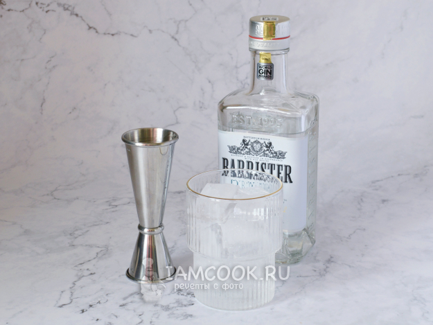 Разложить по двум стаканам лед и влить в каждый по 60 мл джина.