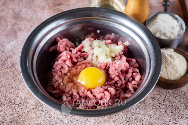 В просторную миску выложите фарш, вбейте к нему яйцо, добавьте соль, черный молотый перец, натрите луковицу на мелкой терке. Перемешайте.