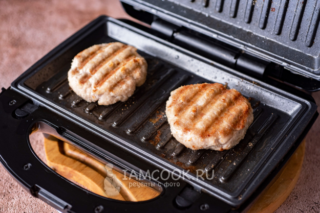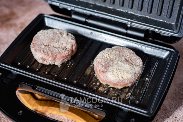 На мультипекарь установите рабочую панель "гриль". Разогрейте мультипекарь до необходимой температуры, смажьте обильно панели растительным маслом с помощью силиконовой кисти. Выложите на подготовленную поверхность мультипекаря партию заготовок ваших котлет и накройте крышкой. Обжаривайте котлеты в соответствии с рекомендациями производителя вашего устройства.