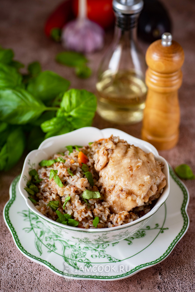 Готовую гречку с курицей разложите по порционным тарелкам, в каждую добавьте по вкусу мелко порубленную зелень и подавайте к столу. Приятного аппетита!