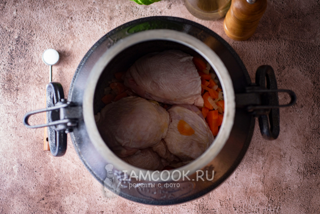 Затем казан с овощами снимите с огня. На морковь и лук выложите куриные части.
