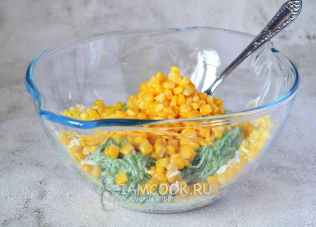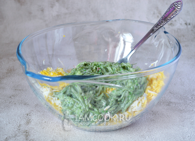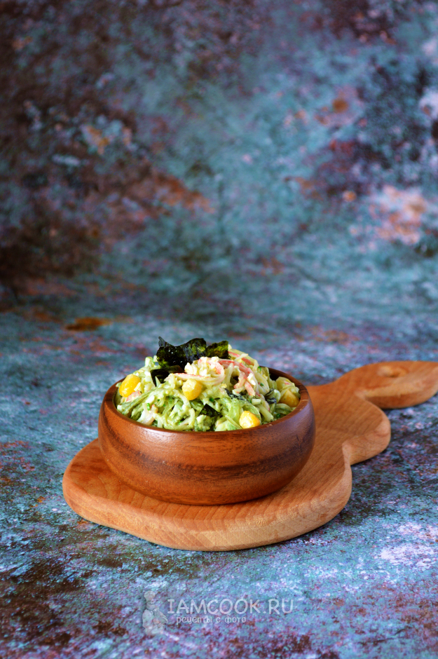 Все хорошо перемешать, и салат с чукой и снежным крабом можно подавать.
