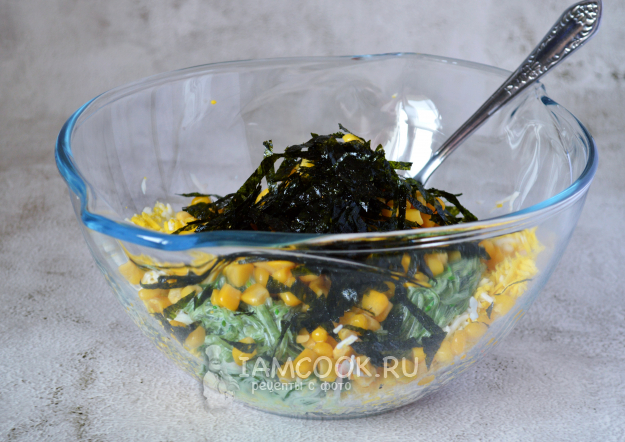 Чипсы нори измельчить и добавить в салат.