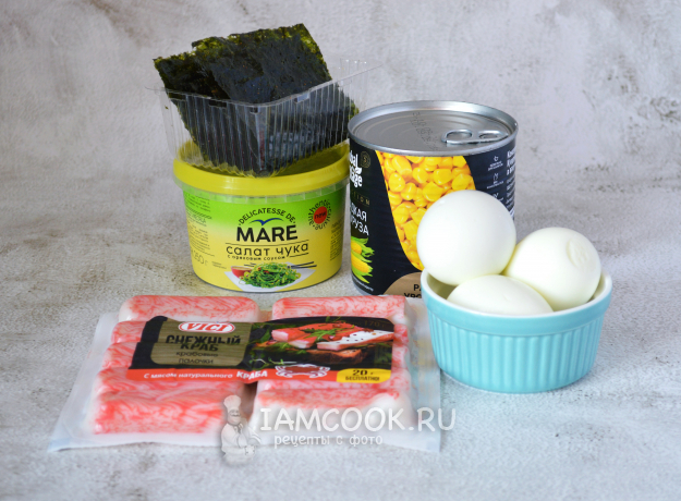Собрать необходимые ингредиенты для приготовления салата с чукой и снежным крабом. Яйца заранее отварить вкрутую, остудить и очистить от скорлупы.