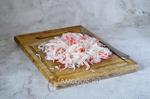 Крабовые палочки "Снежный краб" разделить с помощью вилки на волокна и отправить в салатник.