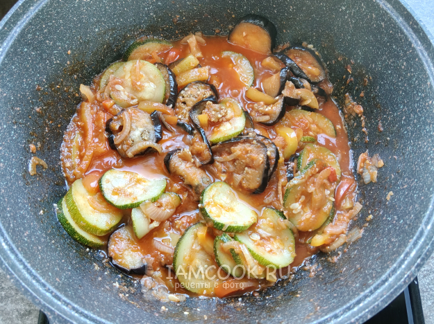 Переложить в соус кабачок/цукини и баклажан.