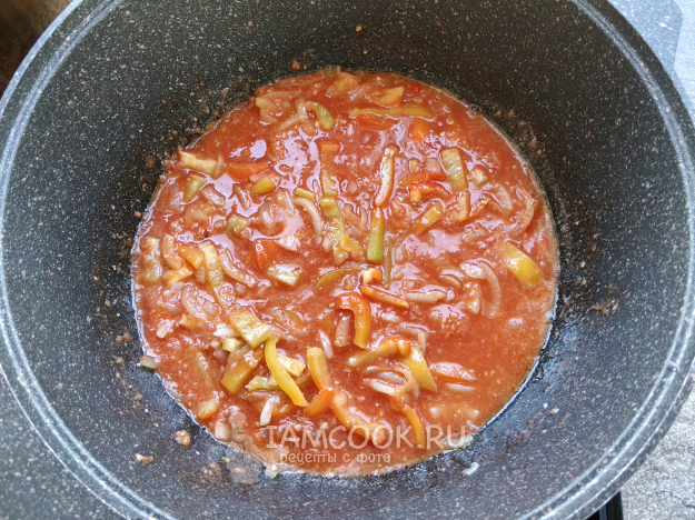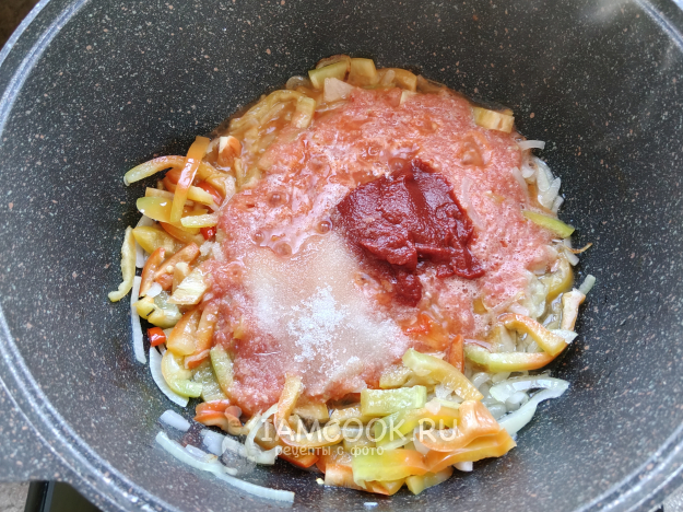 Добавить помидоры, томат, соль и сахар.