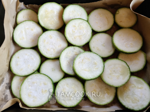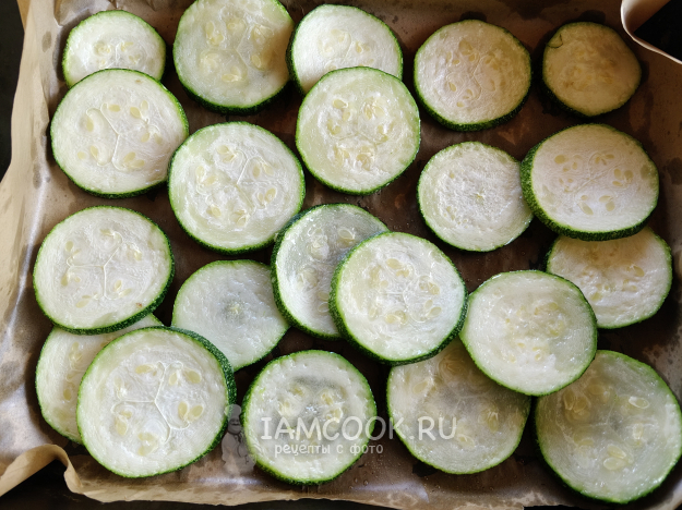 Кабачок/цукини нарезать кольцами. Сбрызнуть маслом.