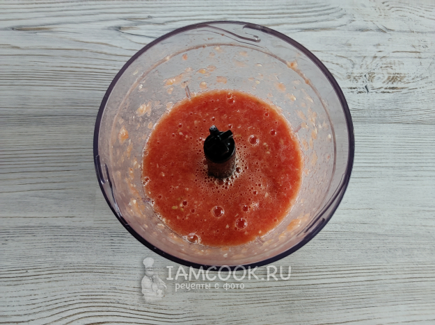 Измельчить томаты вместе с чесноком.