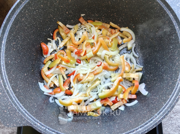 Обжарить перец и лук.