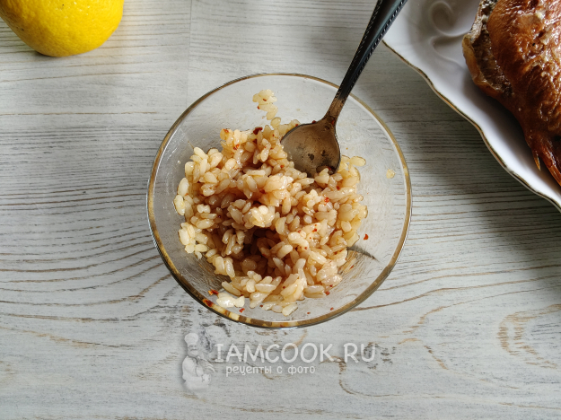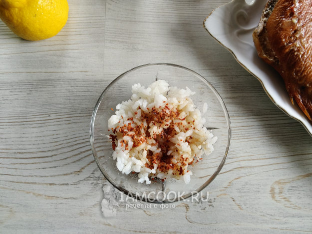 В рис добавить 1 ч.л. масла и соевый соус, можно добавить красного перца, если любите.