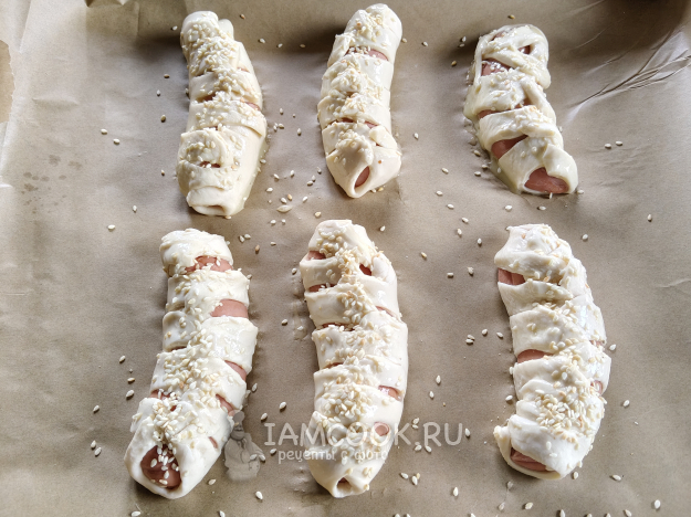 Сардельки в тесте смазать яйцом и посыпать кунжутом.