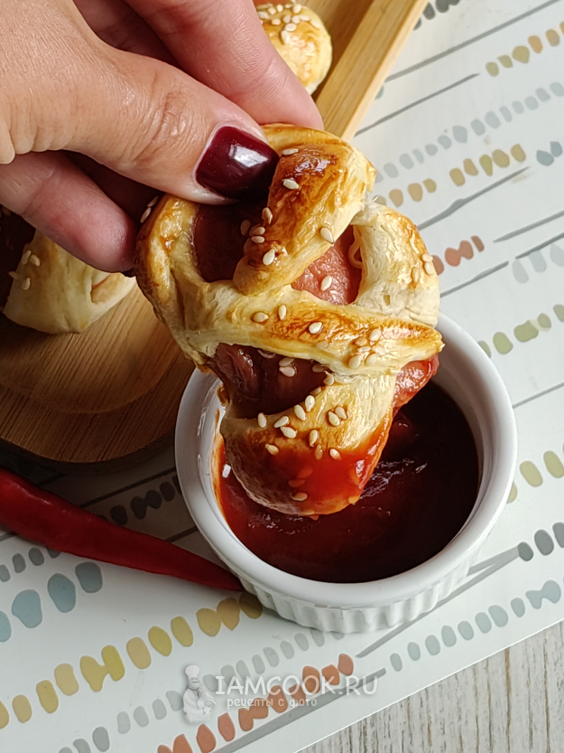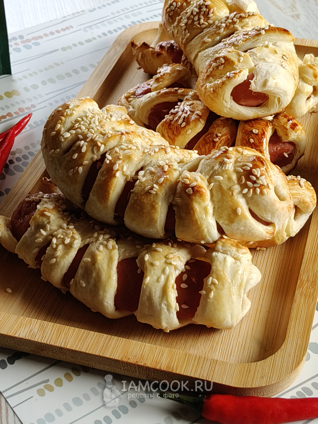 Выпекать сардельки в слоеном тесте в духовке при 180 градусах до румяного состояния, у меня ушло 15 минут.