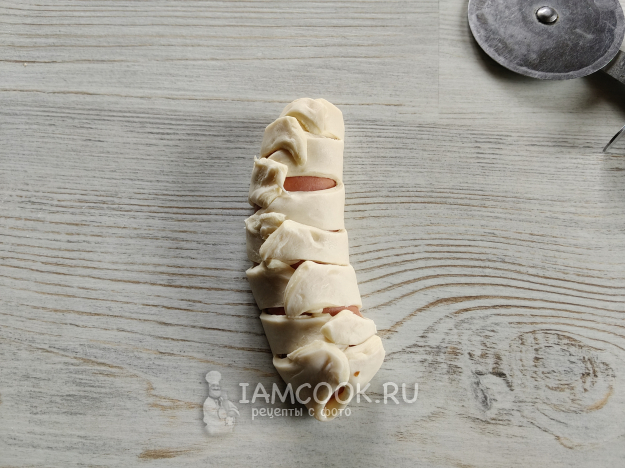 Каждый квадрат слегка раскатать, только чтобы уместить сардельку и чуть-чуть осталось по краям.