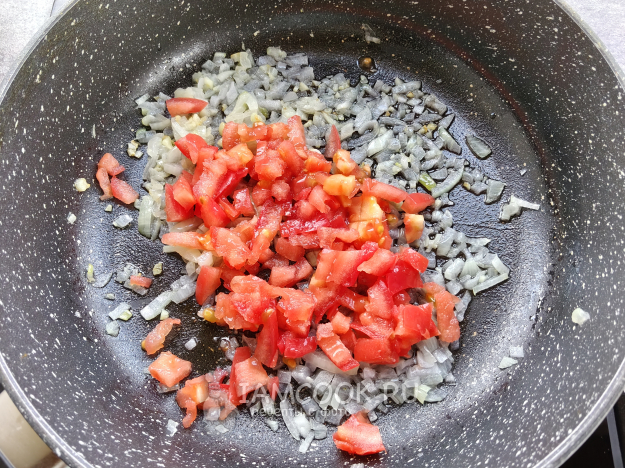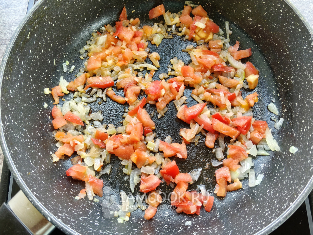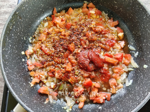 Добавить в сковороду томат, паприку, соль, перец, сахар.