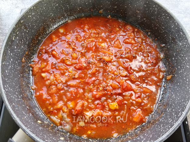 Накрыть сковороду крышкой и потомить соус на среднем огне несколько минут.