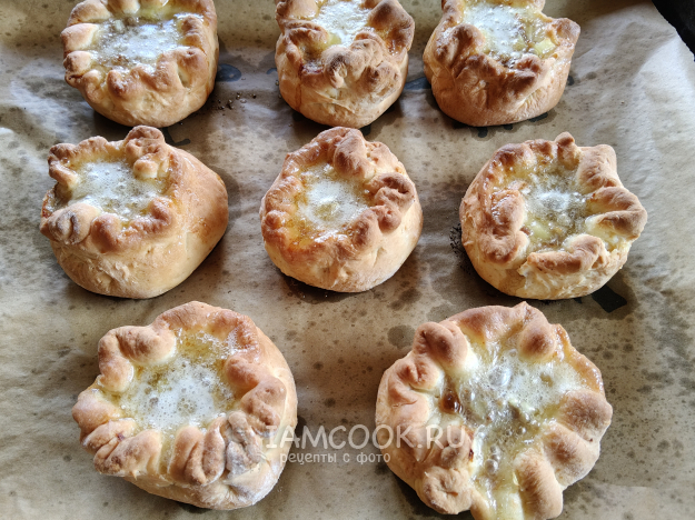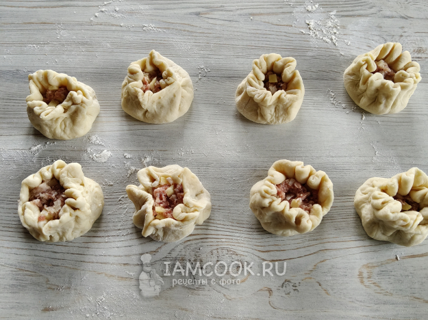 Собрать тесто вверху, как бы гармошкой, защипывая, оставив в центре отверстие.
