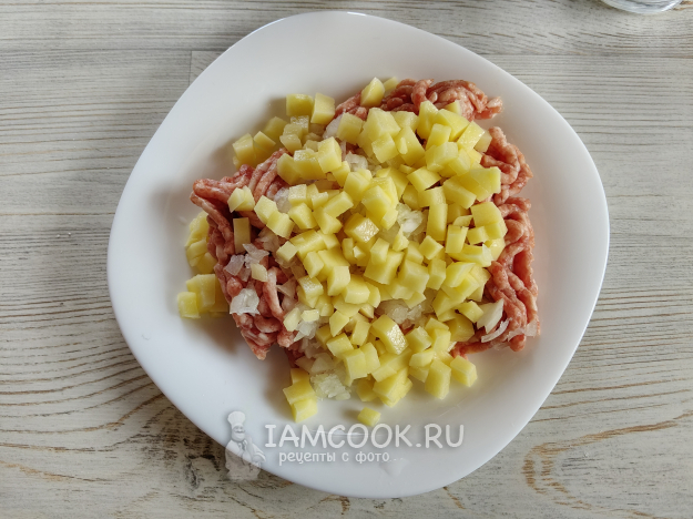 Лук нарезать помельче, картофель тоже нарезать маленькими кубиками.